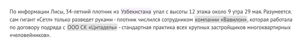 Читаем петербургские новости. Они пестрят сообщениями о том, что на стройках «Сэтл Групп» постоянно погибают мигранты: июнь этого года, плотник из Узбекистана сорвался с 12 этажа, он был трудоустроен в подрядной организации, кто несет ответственность — непонятно.