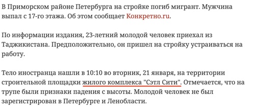 На другом объекте Сэтл Групп с 17-го этажа падает и разбивается мигрант из Таджикистана. Он не был вообще зарегистрирован в Петербурге или Ленобласти — откуда он там взялся и почему работал?
