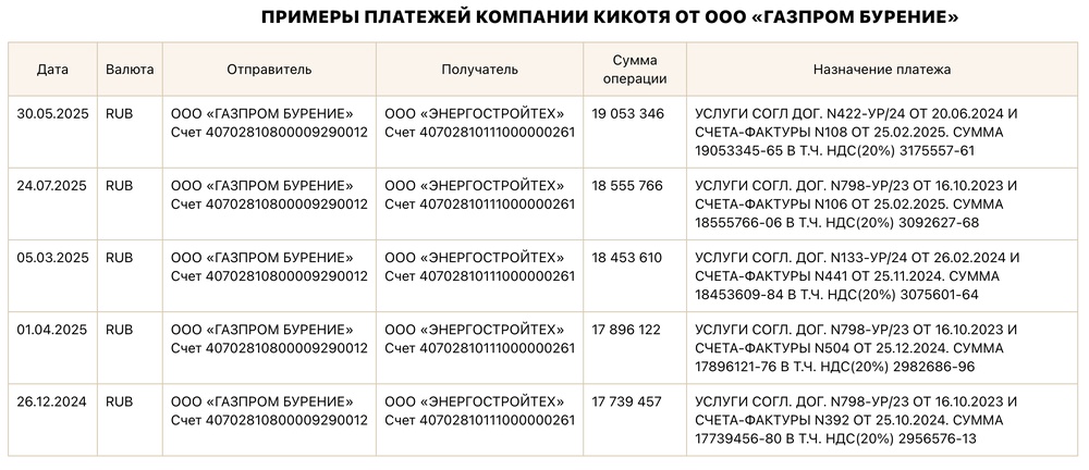 Но Кикотя это никак не реабилитирует. Основной клиент «Энергостройтех» — это государственная компания «Газпром», её дочка «Газпром Бурение», которая за некие услуги заплатила фирме Кикотя более миллиарда рублей за последние полтора года.