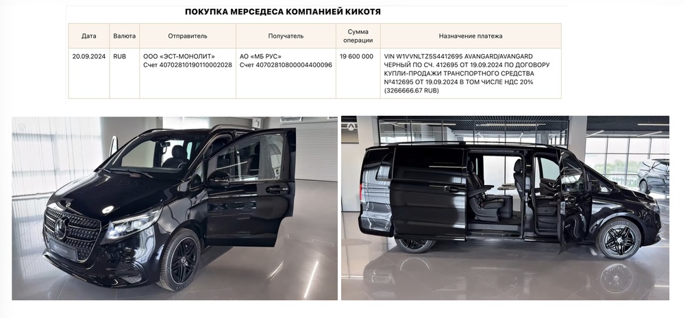 Треть из них, 20 млн рублей, потратили на покупку люксового минивэна Мерседес в топой комплектации, с удлиненным корпусом и роскошным салоном на 8 человек.
