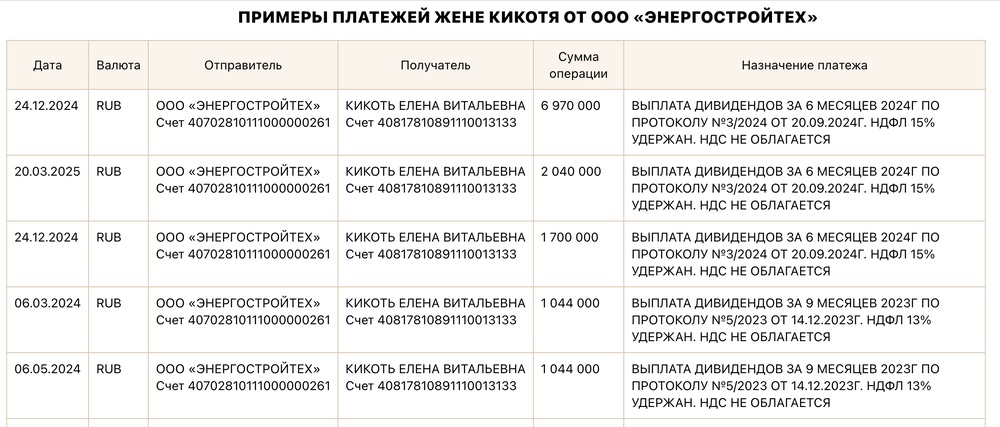В этой фирме жена Кикотя и акционер и сотрудник — в виде зарплаты и дивидендов она получила от ООО «Энергостройтех» 34 млн рублей с 2024 года.
