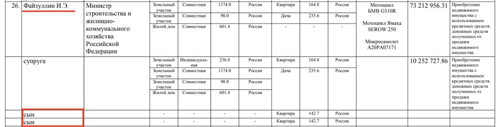 Официальную супругу министра Файзуллина зовут Гузалия Мухамедовна Файзуллина. Она 1957 года рождения, то есть в 2020 году, когда в декларации появились дети, ей было 63 года. И, конечно же, это не её родные дети (и даже не усыновлённые).