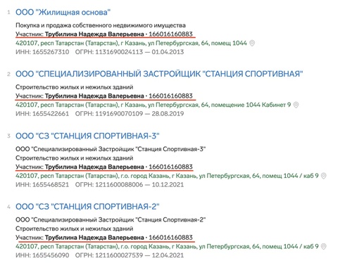 И как мы говорили выше, такая неофициальная жена — идеальный коррупционный инструмент, с помощью которого можно прятать свою собственность. На Надежду Трубилину в Татарстане оформлен бизнес. Естественно, строительный.