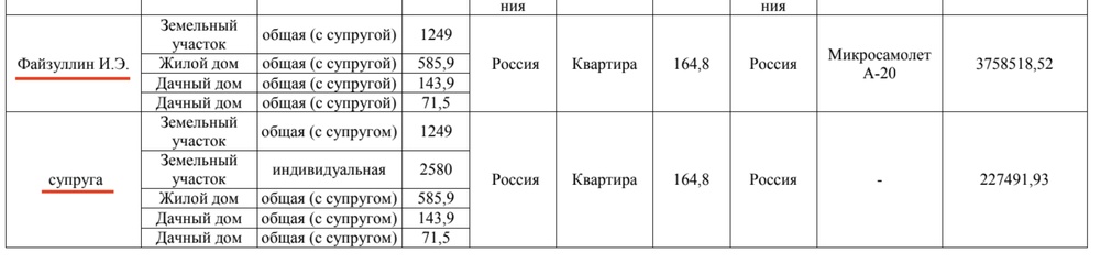 Есть официальная супруга Гузалия — её он показывает нам в декларации: там скромный доход 50 тысяч, 42 года совместной жизни за плечами, традиционные семейные ценности. А есть неофициальная — Надежда, с которой у Файзуллина маленькие дети, быт и, что крайне удобно, её имущество, в отличие от официальной жены, не нужно декларировать и вообще раскрывать — она ему формально никто.