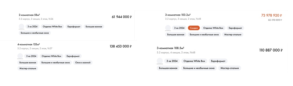 Сколько стоит купить здесь 4 квартиры, узнать несложно. Мы нашли копию сайта застройщика, она сделана примерно в то время, когда Трубилина заключала сделки — здесь указаны цены именно на её квартиры. Квартира № 26 стоит почти 62 миллиона. Соседняя — 138 миллионов, третья, 103-метровая, стоила 74 миллиона, а соседняя с ней — 110 миллионов рублей. Всего — 385.
