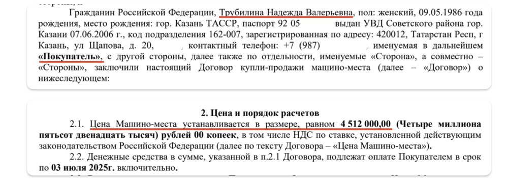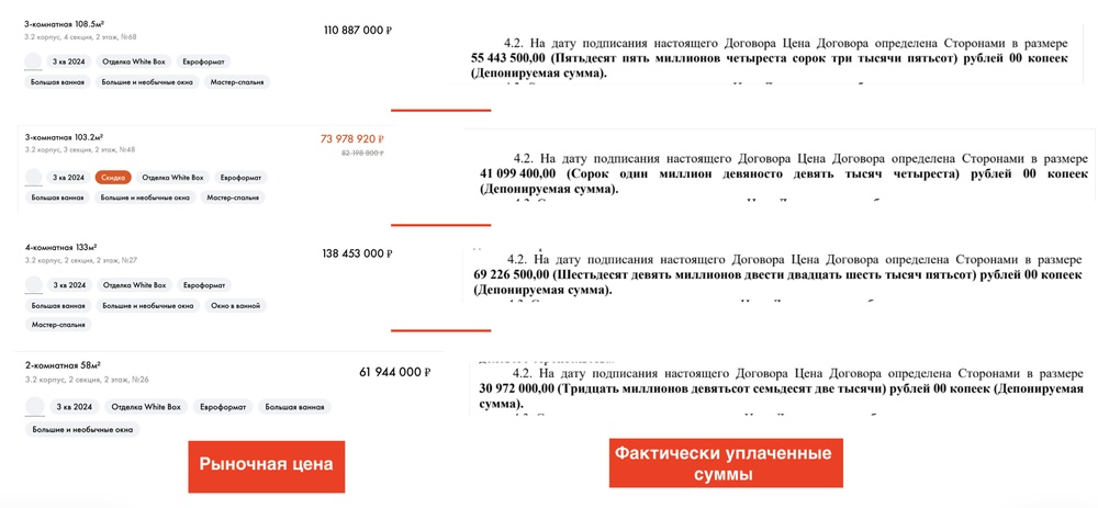 Но теперь самое интересное: в договоре купли-продажи указаны фактически уплаченные суммы. Квадратный метр каждой из квартир достался Трубилиной за 400–500 тысяч рублей — ровно в два раза дешевле, чем это стоило бы обычному покупателю. В два раза дешевле, чем они продавались на рынке. За все четыре квартиры общей площадью 400 квадратных метров она отдала не 385 миллионов, а 196. И нет ни единого объяснения, почему квартиры продали за полцены, кроме очевидного — крупный застройщик таким образом дал 200-миллионную взятку министру строительства.