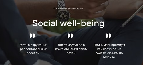 Жильцам обещают экологический вэллбиинг, географический вэллбиинг (это хорошее расположение), физический вэллбиинг (чистый воздух, спортивная инфраструктура), эмоциональный и интеллектуальный вэллбиинги, в которых дети растут личностями с большой буквы.