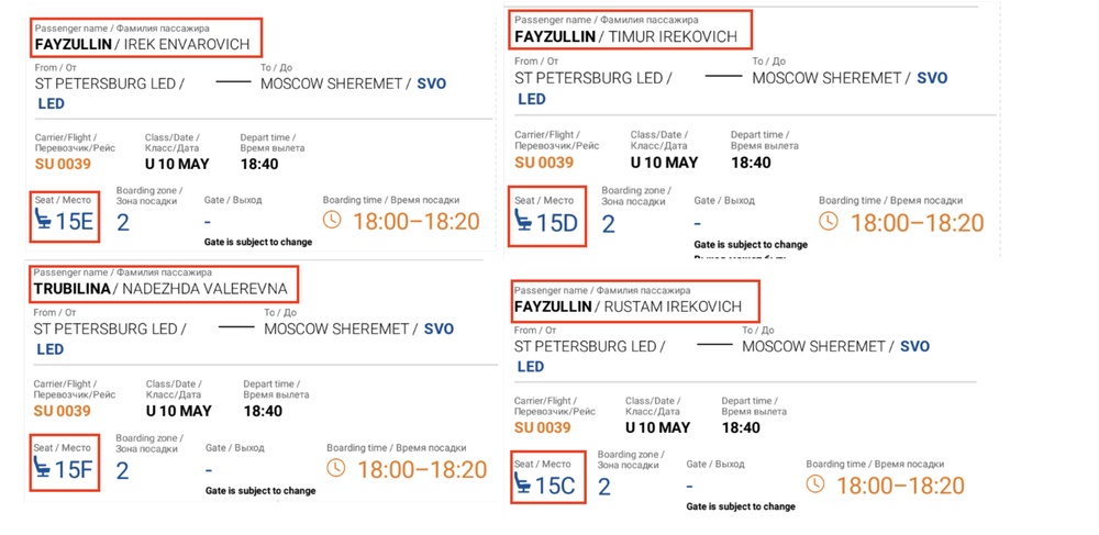В мае 2021 года Ирек Файзуллин возвращался из Питера на самолете, он сидел на месте 15Е. Рядом с ним сидел четырехлетний Тимур Ирекович. На месте 15С — семилетний Рустам Ирекович, а у окошка сидела 35-летняя Надежда Трубилина. Это их мама.